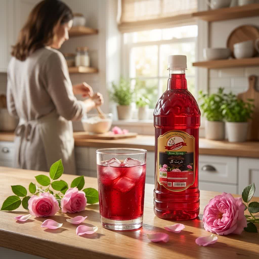 - **کاربردها**: شربت گل رز کاربردهای گستردهای دارد. معمولاً آن را با آب سرد و یخ به عنوان یک نوشیدنی خنک و سنتی (مخصوصاً در ماه رمضان یا فصول گرم سال) سرو میکنند . همچنین به عنوان یک طعمدهنده عالی در انواع نوشیدنیهای مدرن (مانند موکتلها و اسموتیها)، دسرها، کیکها و حتی برخی غذاها استفاده میشود .